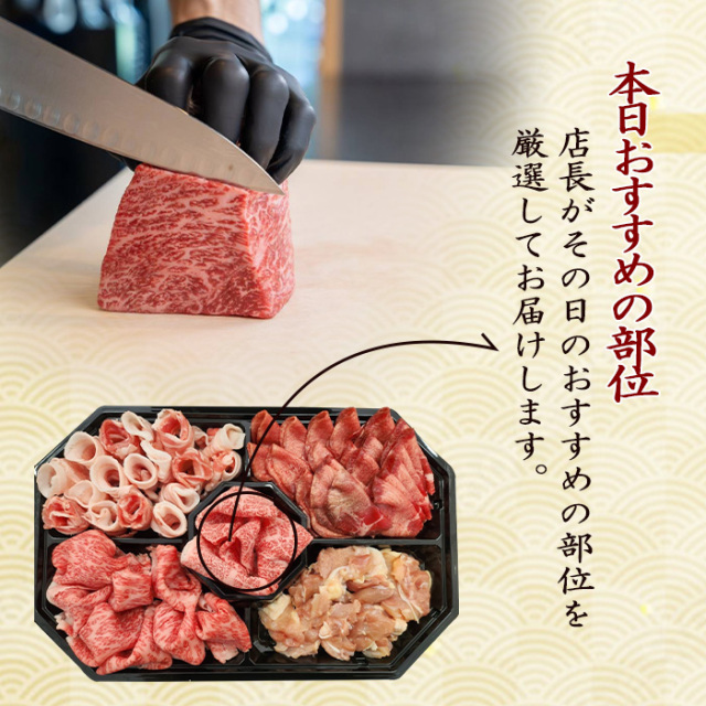 | 内容量 | 約1kg(伊賀牛ロース、三重県産豚バラ、三重県産鶏もも、輸入タン 各250g) |